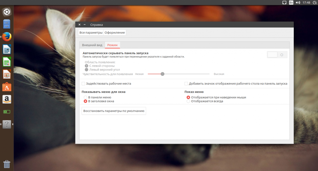 Многие пользователи хотят видеть меню не глобально, а отдельно в заголовке каждого окна. В таком случае откройте «Настойки системы» -> «Внешний вид» или просто «Изменить фон», затем перейдите на вкладку «Режим» и выберите «Показывать меню для окна» -> «В заголовке окна»: