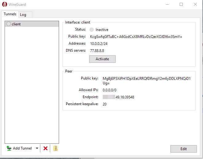 Нажмите кнопку ‘Activate’ и соединение будет установлено. В настройках подключения будет содержаться публичный ключ, порт подключения, назначенный IP адрес.