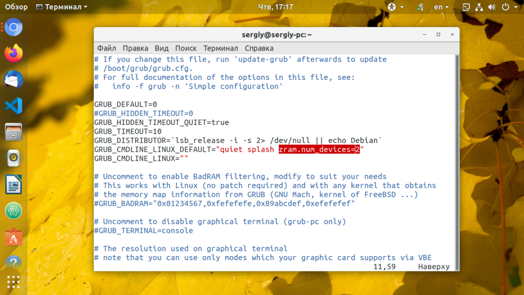 Когда модуль загружен надо установить параметр ядра zram.num_devices который указывает максимальное количество сжатых устройств. Например для двух блочных устройств используйте добавьте в переменную GRUB_CMDLINE_LINUX_DEFAULT следующий параметр: