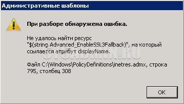 То означает, у вас поврежден файл административного шаблона для Internet Explorer, который размещен по адресу C:ВиндовсPolicyDefinitions. Исправляется это довольно легко, для этого нужно только скачать файлы административных шаблонов отсюда (ссылка на официальный сайт Microsoft). Затем переходим в директорию C:WindowsPolicyDefinitions и заменяем файлы inetres.adm, inetres.admx, а так же папки с нужными языками. После этого нужно перезапустить консоль управления, и убедиться, что ошибка прошла.