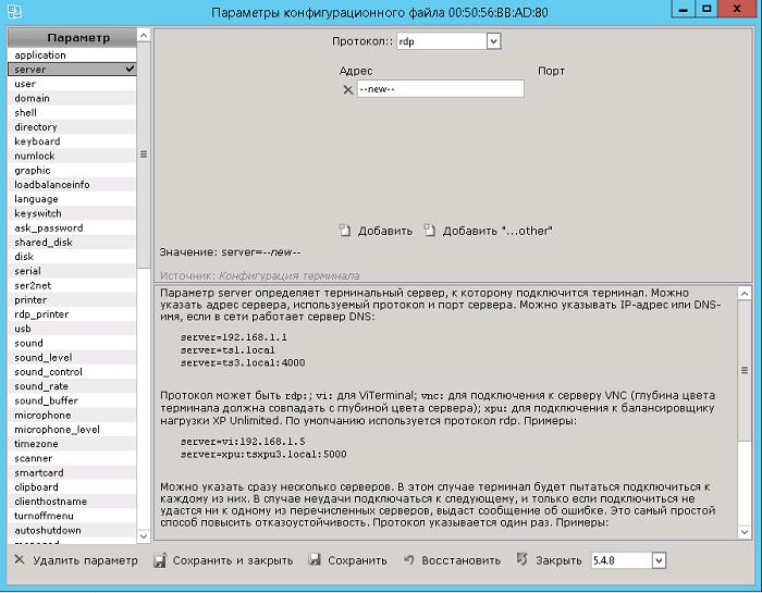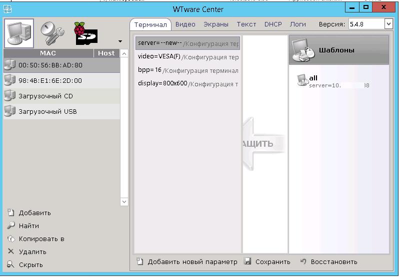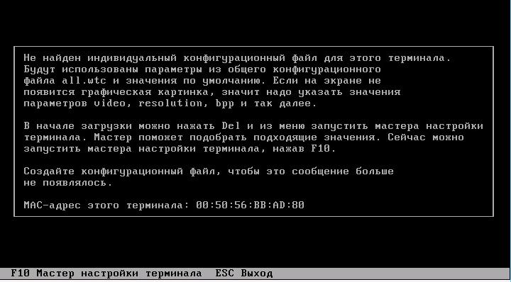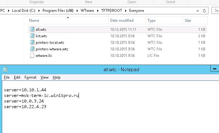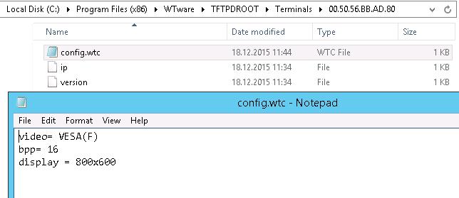 Для этого на TFTP сервере в каталоге C:Program Files (x86)WTwareTFTPDROOTTerminals0.50.56.BB.AD.80 (каталог с именем, содержащим MAC адрес клиента) создадим файл config.wtc, в котором будут указаны настройки клиента: