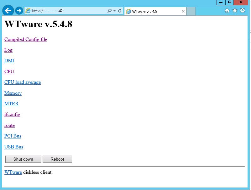 Для диагностики работы клиентов, на каждом терминале функционирует маленький веб-сервер. Чтобы открыть диагностическую страничку, достаточно набрать ip адрес клиента в браузере. На открывшейся веб странице можно посмотреть текущие настройки клиента, состояние его компонентов, логи, кнопки выключения/перезагрузки клиента и т.д.