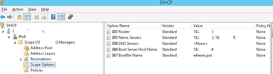 Предполагается, что в нашей сети уже развернут и используется DHCP сервер на любой серверной редакции Windows. Запускаем консоль управления DHCP (dhcpmgmt.msc) и находим интересующую нас DHCP зону (в нашем случае имя зоны – Managers). Нам нужно прописать дополнительные настройки зоны, необходимые для сетевой загрузки бездисковых терминалов.