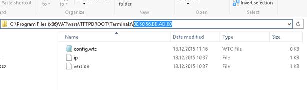 Индивидуальные конфигурационные файлы каждого клиента хранятся в каталоге C:Program Files (x86)WTwareTFTPDROOTTerminals. Для каждого клиента создается персональный каталог с его MAC адресом. Именно в этом каталоге клиент будет искать файл config.wtc со своей конфигурацией.