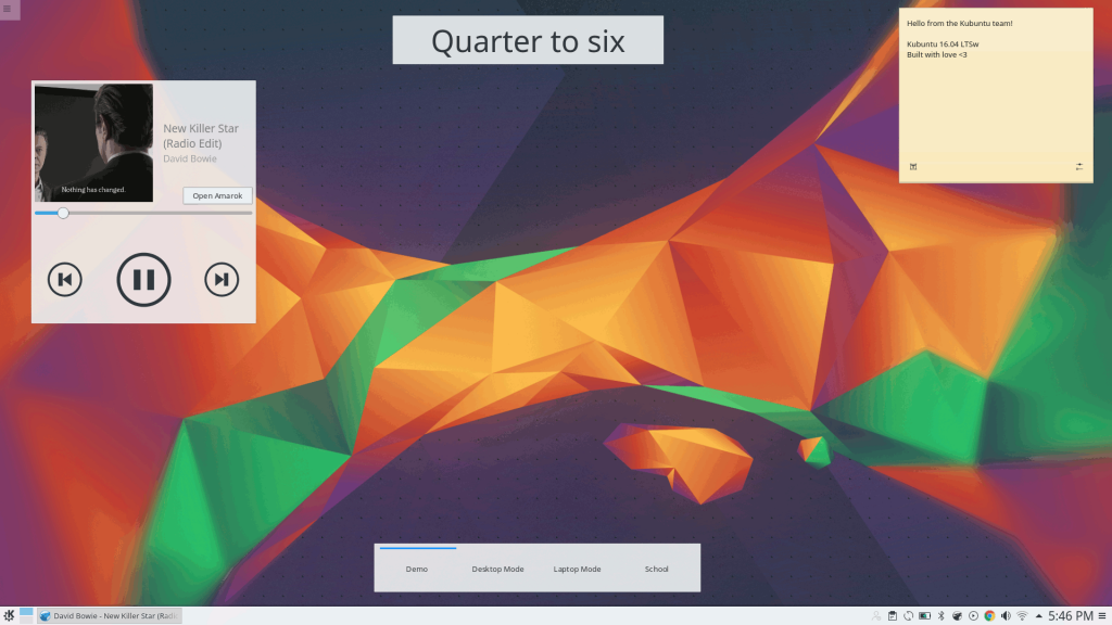 Этот релиз не получил много обновлений и улучшений, поскольку это LTS версия с длинным сроком поддержки и она должна быть полностью стабильна. Но все же кое-что изменилось, по-прежнему используется Plasma 5 и KDE Frameworks 5, был добавлен новый центр приложений Plasma Discover, обновлен KDE PIM. В этот релиз вошли приложения набора KDE Applications 15.12, а также LibreOffice 5.1 и Firefox 45.