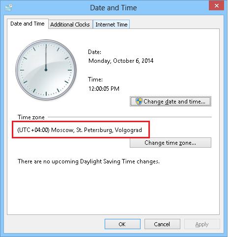 Название новой часовой зоны Отображение новой часовой зоны в Windows Название текущей часовой зоны Отображение текущей часовой зоны в Windows Russia Time Zone 1 (UTC+02:00) Kaliningrad (RTZ 1) Kaliningrad Standard Time (UTC+03:00) Kaliningrad, Minsk Russia Time Zone 2 (UTC+03:00) Moscow, St. Petersburg, Volgograd (RTZ 2) Russian Standard Time (UTC+04:00) Moscow, St. Petersburg, Volgograd Russia Time Zone 4 (UTC+05:00) Ekaterinburg (RTZ 4) Ekaterinburg Standard Time (UTC+06:00) Ekaterinburg Russia Time Zone 5 (UTC+06:00) Novosibirsk (RTZ 5) N. Central Asia Standard Time (UTC+07:00) Novosibirsk Russia Time Zone 6 (UTC+07:00) Krasnoyarsk (RTZ 6) North Asia Standard Time (UTC+08:00) Krasnoyarsk Russia Time Zone 7 (UTC+08:00) Irkutsk (RTZ 7) North Asia East Standard Time (UTC+09:00) Irkutsk Russia Time Zone 8 (UTC+09:00) Yakutsk (RTZ 8 ) Yakutsk Standard Time (UTC+10:00) Yakutsk - Три новые часовые зоны