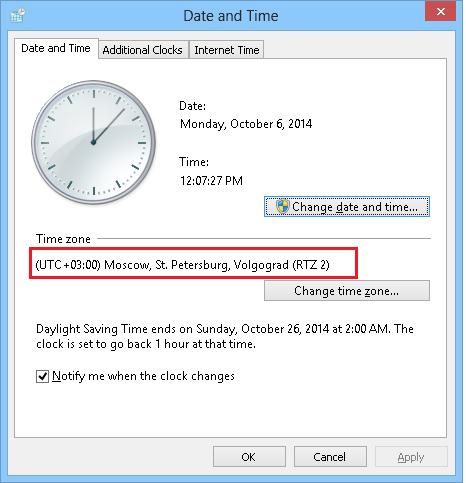 КорпорацияMicrosoft 23 сентября 2014 г для пользователей России выпустила накопительное обновление КВ2998527 (http://support.microsoft.com/kb/2998527), предназначенное для корректного перехода на зимнее время и учета других изменения в порядке исчисления времени на российских компьютерах с ОС семейства Windows. Данное обновление должно помочь системе определить актуальную часовую зону и правильно изменить время 26 октября 2014 года.