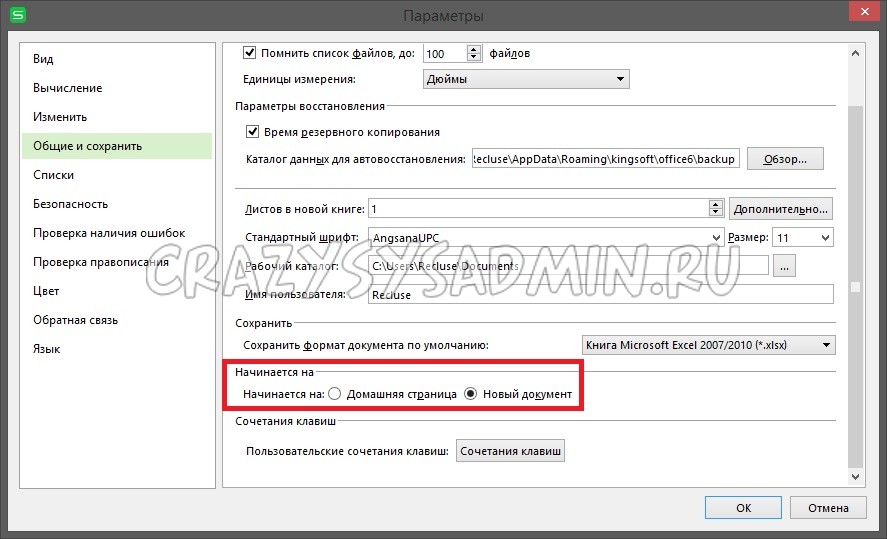 Открываем Параметры программы (находится в меню, которое вызывается нажатием на полоску с названием программы, в левом верхнем углу), там находим вкладку «Общие и сохранить». В самом низу есть опция «Начинается на», которая и отвечает за выбор того действия, которое будет делать программа при запуске. Как не трудно догадаться, опция «Домашняя страница» открывает страницу с шаблонами, а «Новый документ» — пустую страницу нового документа. Выбрав нужный вариант, сохраняем и закрываем настройки кнопкой «ОК».