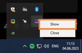 - В трее находим значок RivaTunerStatisticsServer, и нажимаем по нему левой кнопкой мыши, в результате чего должно открыться главное окно программы. Альтернативный вариант вызова главного окна программы — нажать по значку в трее правой кнопкой мыши, и в появившемся контекстном меню выбрать пункт «Show».
