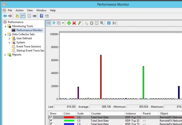Итак, откройте консоль Performance Monitor (perfmon.exe) и добавьте счётчик RemoteFX Network/Total Sent Rate(*) – счетчик ведет учет скорости передачи исходящего трафика от терминального сервера (бит/сек).