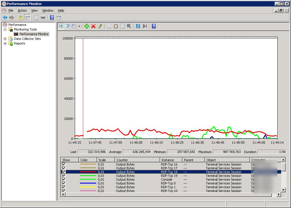 В Windows Server 2008 R2 данных счетчиков производительности нет, поэтому ориентировочные значения трафика сессий можно оценить с помощью счетчиков группы Terminal Services Session: Output Bytes / Input Bytes.
