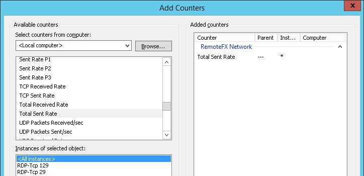 Microsoft предлагает два способа получить доступ к данным использования пропускной способности сети для каждой RDP сессии пользователей: через счетчики производительности или через RDS API. Готового решения, использующего данные RDS API мне найти не удалось. Остаются счетчики. Перебрав множество счетчиков производительности мне удалось найти подходящие.