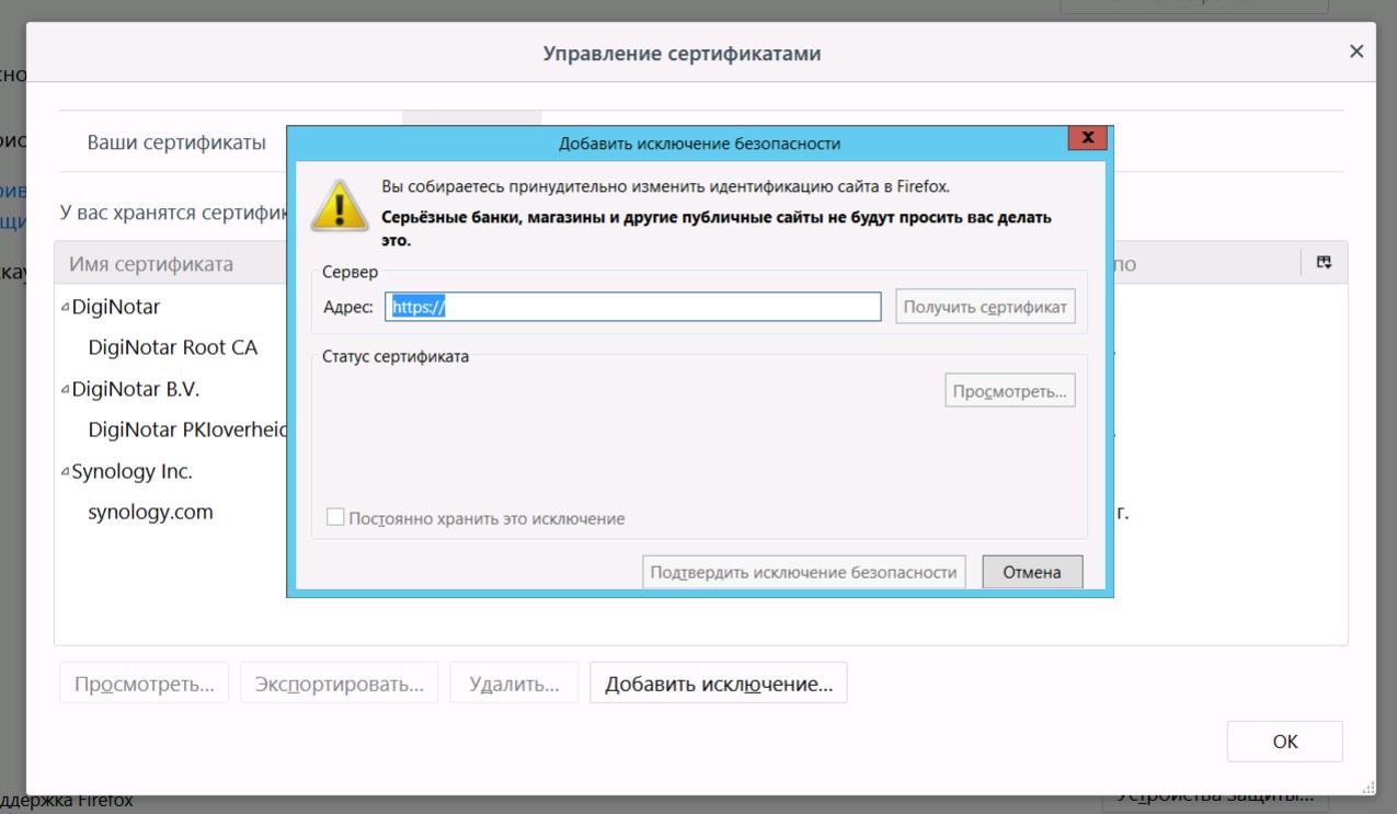 - Например, когда FireFox «решил», что лучше знает и не станет даже предлагать добавлять сайт в исключения.