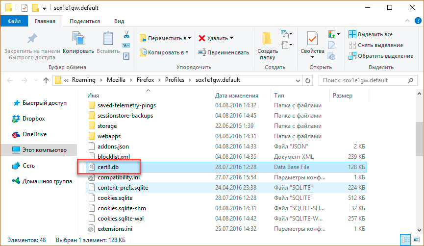 - В открывшейся папке найдите файл cert8.db и удалите.