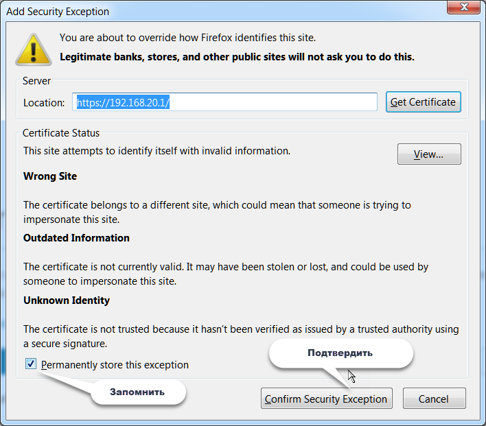 Прямо отсюда можно добавить в исключение новый сертификат, нажав кнопку Добавить исключение (Add exception).