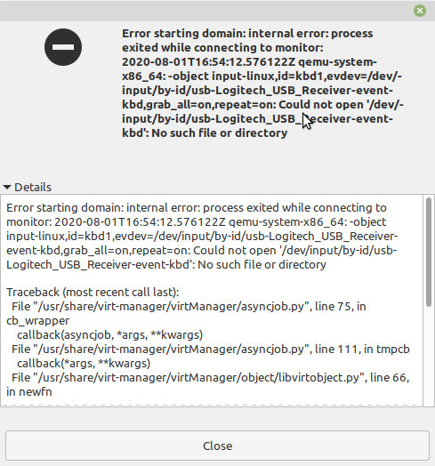 libvirt.libvirtError: internal error: process exited while connecting to monitor: 2020-08-01T16:54:12.576122Z qemu-system-x86_64: -object input-linux,id=kbd1,evdev=/dev/input/by-id/usb-Logitech_USB_Receiver-event-kbd,grab_all=on,repeat=on: Could not open ‘/dev/input/by-id/usb-Logitech_USB_Receiver-event-kbd’: No such file or directory