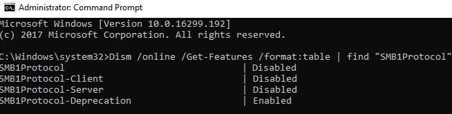 Dism /online /Get-Features /format:table | find "SMB1Protocol"