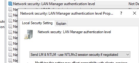 Затем в настройке локальной политики безопасности ( secpol.msc) Local Policies -> Security Options -> Network security: LAN Manager authentication level выберите Send LM & NTLM — use NTLMv2 session security if negotiated.