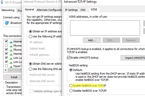 netsh int ip reset - Если вы используете сеть на базе рабочей группу Windows, включите поддержку протокола NetBIOS в свойствах TCP/IPv4 вашего сетевого адаптера.