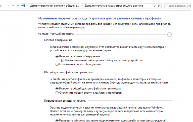 В разделе Network and Sharing Center панели управления на обоих компьютерах проверьте, что в качестве текущего сетевого профиля используется частный профиль – Private (Current profile). Убедитесь, что включены следующие опции: