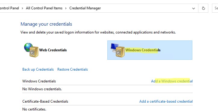 Нажмите Add a Windows credentials и укажите имя файлового сервера и учетные данные для подключения.
