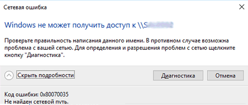 Сетевая ошибка Windows не может получить доступ к \NAS Проверьте правильность написания данного имени. В противном случае возможно проблема с вашей сетью. Для определения проблем с сетью щёлкните кнопку «Диагностика». Код ошибки 0x80070035. Не найден сетевой путь.