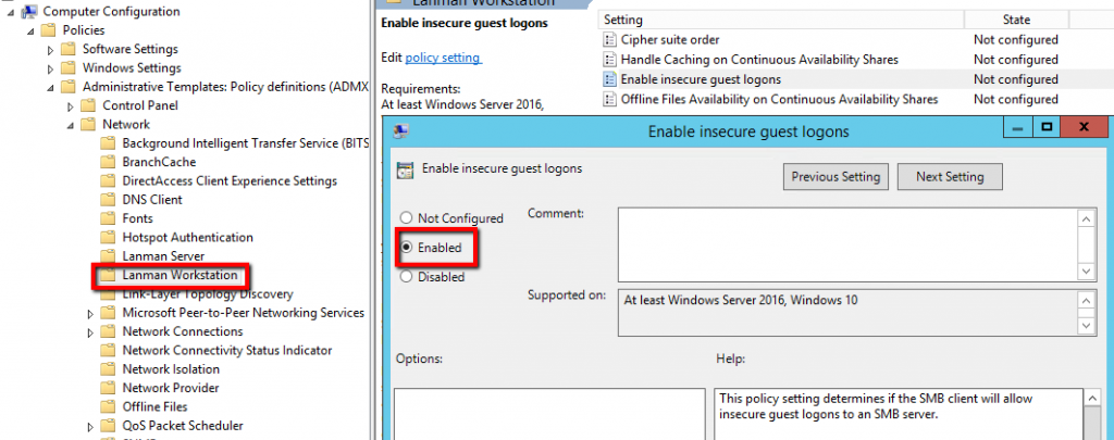 Чтобы разрешить гостевой вход по SMBv2 (считается небезопасным!), откройте редактор локальных политик Windows 10 (gpedit.msc) включить политику Enable insecure guest logons (Включить небезопасные гостевые входы) в секции GPO Computer Configuration -> Administrative templates -> Network (Сеть)-> Lanman Workstation.