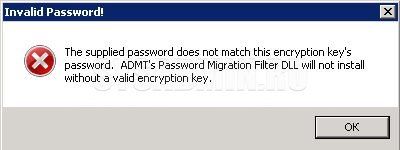 The supplied password does not match this encyption key’s password. ADMT’s Password Migration Filter DLL will not install without a valid encryption key.
