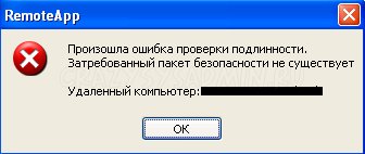 Данная ошибка встречается, когда на Виндовс XP SP3 был установлен фикс от майкрософт (MicrosoftFixit50588.msi), для активации режима сквозной авторизации, про который мы писали в нашей статье: RemoteApp & Remote Desktop вход на терминальный сервер без ввода логина и пароля