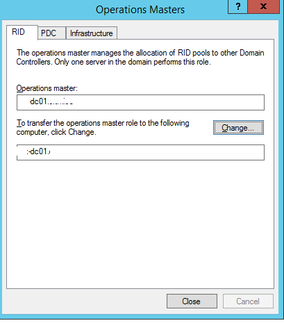 3. Перед вами появится окно с тремя вкладками (RID, PDC, Infrastructure), на каждой из которых можно передать соответствующую роль, указав нового владельца FSMO роли и нажав кнопку Change.