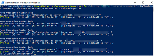 Move-ADDirectoryServerOperationMasterRole -Identity dc03 -OperationMasterRole 0,1,2,3,4