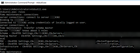 8. После переноса ролей нажмите q и Enter, чтобы завершить работу с ntdsutil.exe;