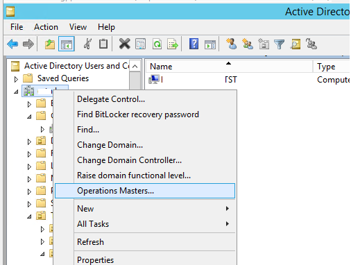 2. Щелкните правой кнопкой по имени вашего домена и выберите опцию Operations Master;