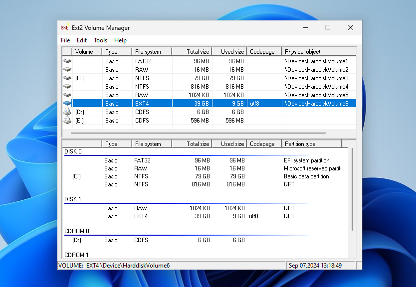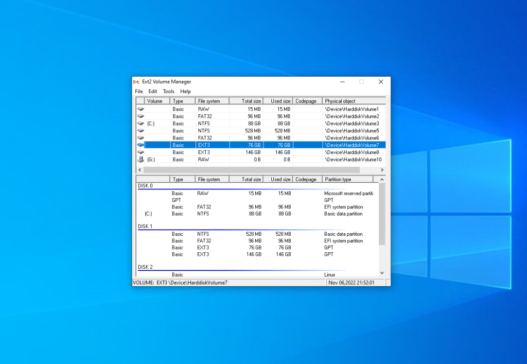 После установки запустите Ext2 Volume Manager из меню приложений системы. Поскольку это форк Ext2fsd тут используется тот же Volume Manager и настройки у него такие же. Вы можете просмотреть все доступные разделы с файловой системой Ext4 в главном окне: