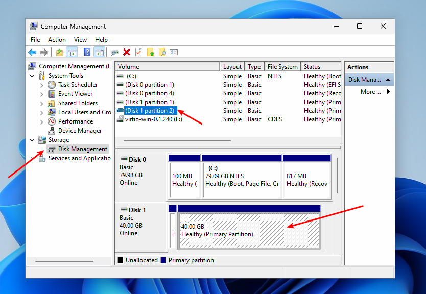 Здесь в поле DeviceID указан идентификатор диска, который вам нужен, а в колоке Size размер. В этом примере на диске PHYSICALDRIVE0 установлена Windows, а на PHYSICALDRIVE1 находится раздел Linux, который надо примонтировать. Я могу понять это по размеру, потому что знаю что размер диска с Linux 40Гб. Но удобнее это делать у Диспетчере дисков. Сделайте клик правой кнопкой мышки по This PC и октройте Manage -> Disk Management.