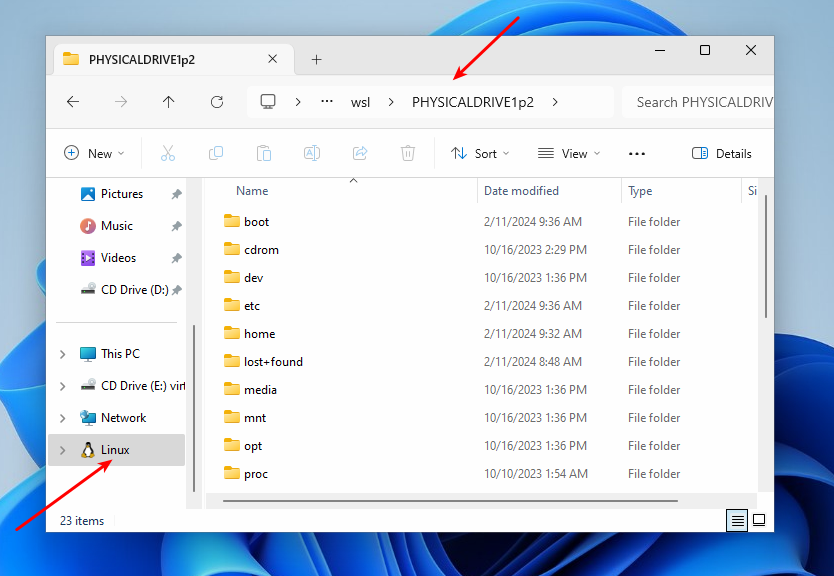 После этого раздел будет смонтирован внутри WSL в папке /mnt/wsl/PHYSICALDRIVE1p2. И более того, вы можете открыть его в проводнике. Откройте Linux -> Ubuntu -> /mnt/ -> wsl и название вашего диска.