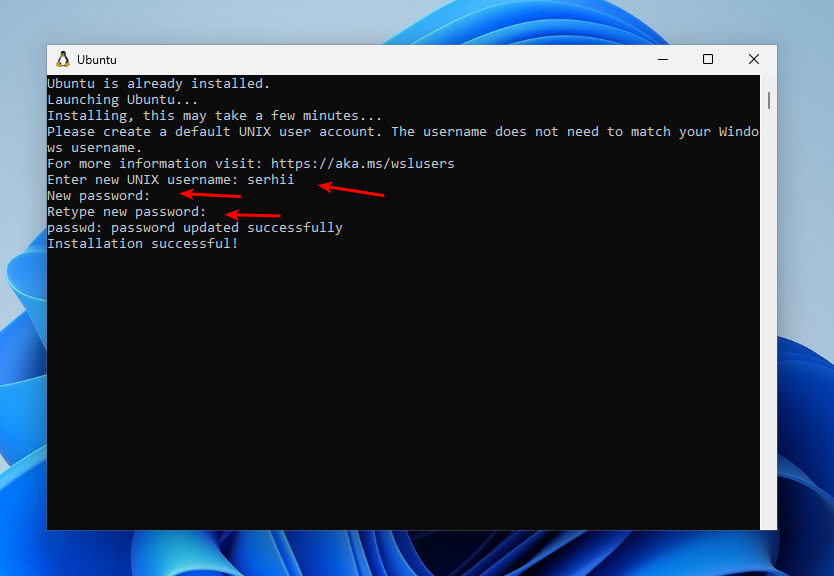 Команда активирует все некобходимые компоненты, скачает и установит окружение Linux. По умолчанию будет использоваться дистрибутив Ubuntu. После выполнения команды нужно перезапустить компьютер. После перезагрузки установка WSL продолжится и вам нужно будет указать имя пользователя и пароль для Linux: