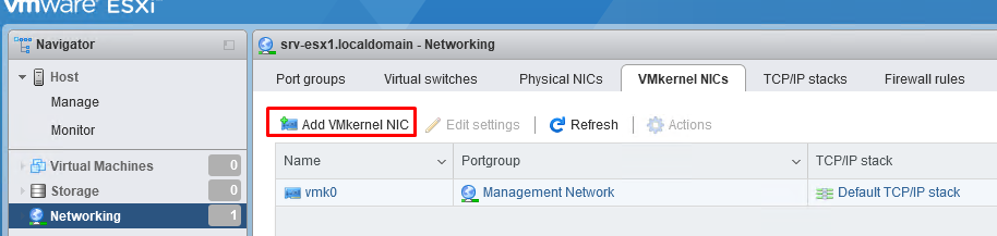 Сначала нужно создать отдельный VMkernel сетевой интерфейс, который будет испоьзоваться ESXi хостом для доступа к iSCSI хранилищу. Перейдите в раздел Networking -> VMkernel NICs -> Add VMkernel NIC.