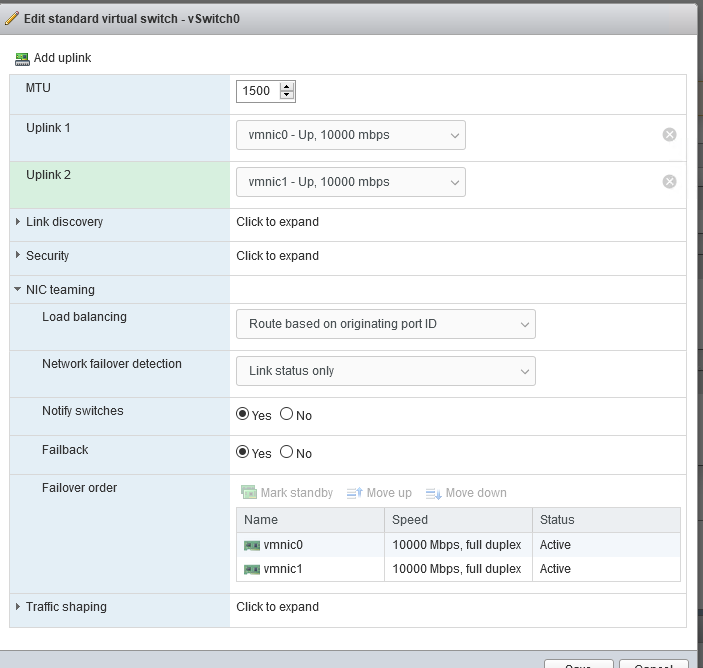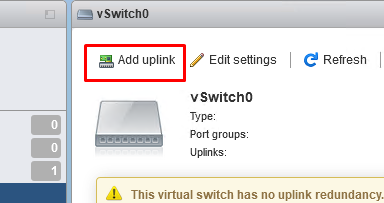 Теперь перейдите в настройки вашего стандартного коммутатора vSwitch0 (Networking -> Virtual Switches). Проверьте, что второй физический интерфейс сервера vmnic1 добавлен в конфигурацию и активен (если нет, нажмите кнопку Add uplink и добавьте его).