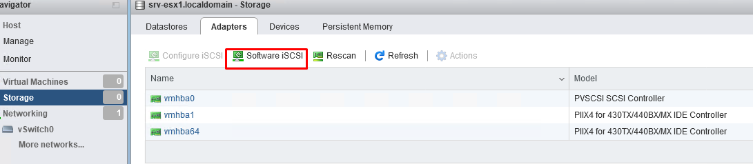 По умолчанию в ESXi отключен программный адаптер iSCSI. Чтобы включить его, перейдите в раздел Storage -> Adapters. Нажмите на кнопку Software iSCSi.