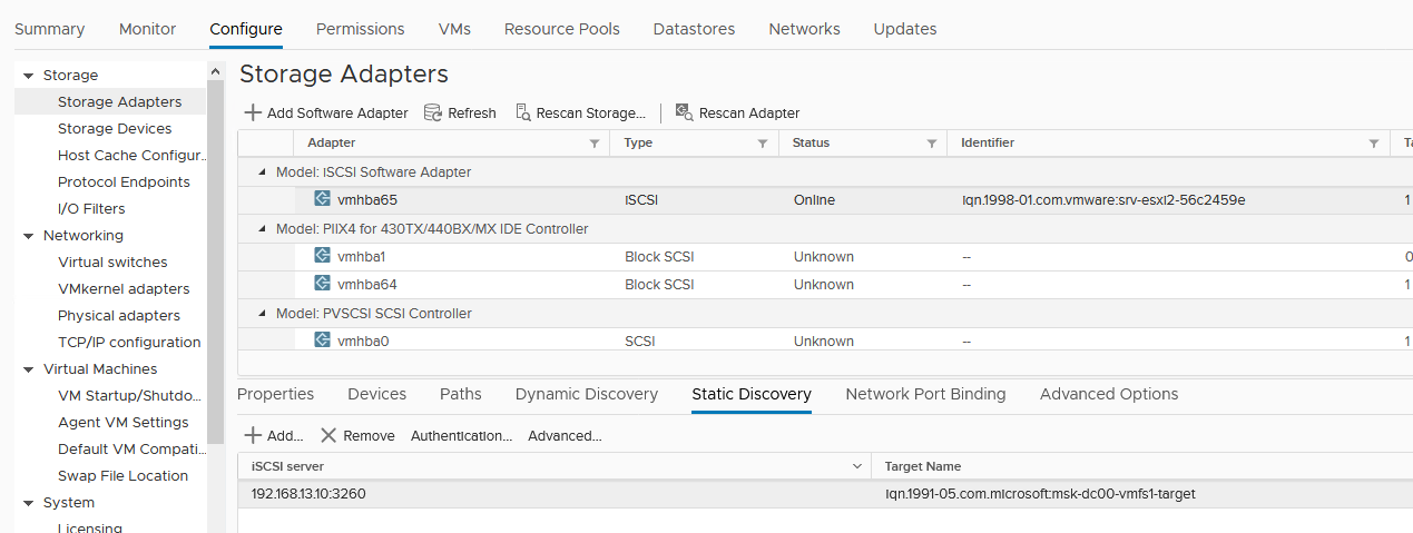 Если ESXi хост подключен к vCenter, чтобы добавить iSCSI LUN, перейдите в раздел Configure -> Storage –> Storage Adapters. Выберите Software iSCSI adapter и укажите на вкладке Dynamic Discovery имя или IP адрес вашего iSCSI хранилища. Выполните Rescan. Список доступных iSCSI таргет должен появится на вкладке Static Discovery.