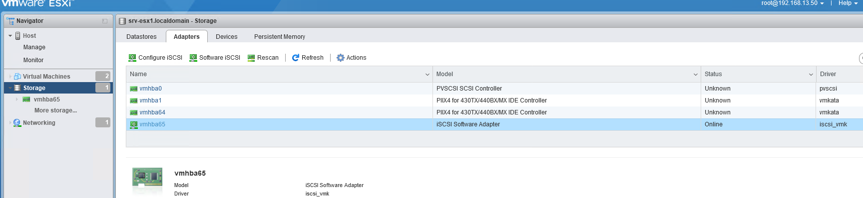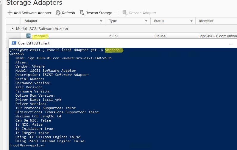 vmhba65 Name: iqn.1998-01.com.vmware:srv-esx1-1487e5fb Alias: Vendor: VMware Model: iSCSI Software Adapter Description: iSCSI Software Adapter