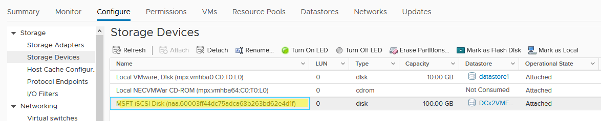 Если на данном LUN уже создано VMFS хранилище, оно сразу появится в списке доступных Storage Devices хоста.