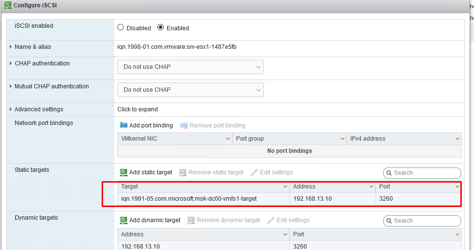 Затем в секции Dynamic targets добавьте IP адрес вашего iSCSI хранилища и порт подключения (по-умолчанию для iSCSI трафика используется порт TCP 3260). ESXi просканирует все iSCSI таргеты на этом хосте и выведет их в списке Static Targets.