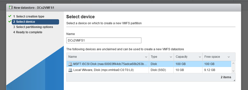 Задайте имя VMFS хранилища и выберите iSCSI LUN, на котором его создать.