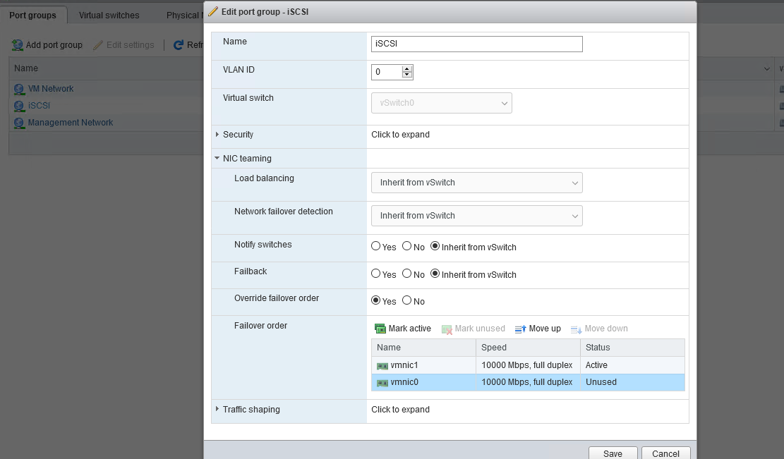 Теперь в настройки группу портов iSCSI вам нужно разрешить использовать для iSCSI трафика только второй интерфейс. Перейдите в Networking -> Port groups -> iSCSI> Edit settings. Разверните секцию NIC teaming, выберите Override failover order = Yes. Оставьте активной только vmnic1, порт vmnic0 переведите в состояние Unused.