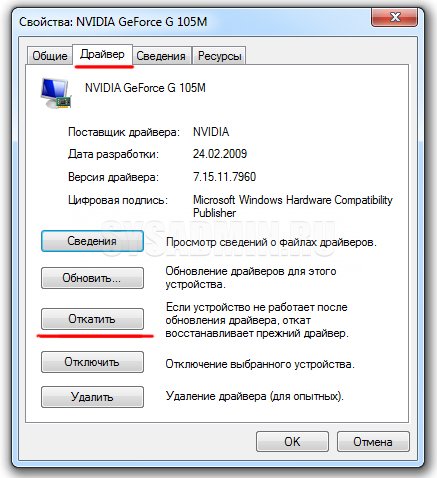 Переходим во вкладку «Драйвер» и нажимаем на кнопку «Откатить«.