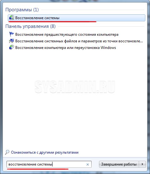 После запуска безопасного режима переходим в меню «Пуск» и задаем «Восстановление системы«.