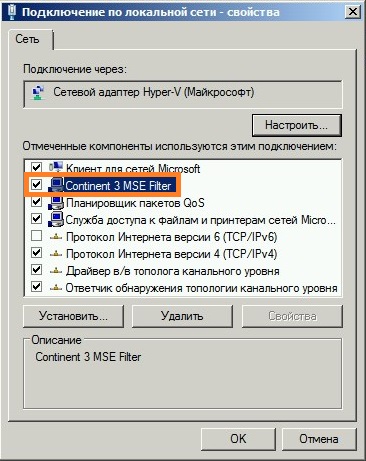 3. В открывшихся свойствах подключения, нужно найти компонент под названием «Continent 3 MSE Filter», и снять с него галочку.