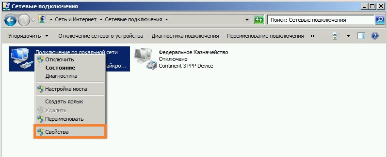 2. В списке сетевых подключений нужно выбрать то, которое отвечает за работу нужной сети, отключение которой нужно предотвратить. Если речь идет про обычный компьютер с единственным подключением к локальной сети, то по умолчанию такое подключение будет называться «Подключение по локальной сети». Нажимаем на нем правой кнопкой мыши и в контекстном меню выбираем пункт «Свойства».